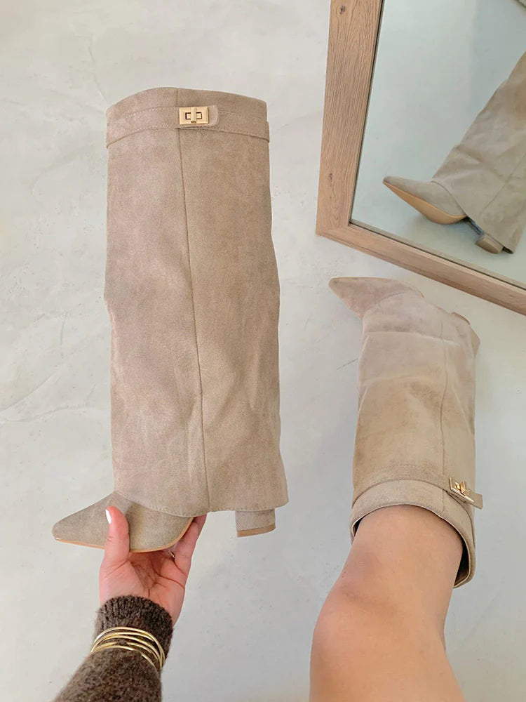 Fold Chunky Heel Knee High Boots