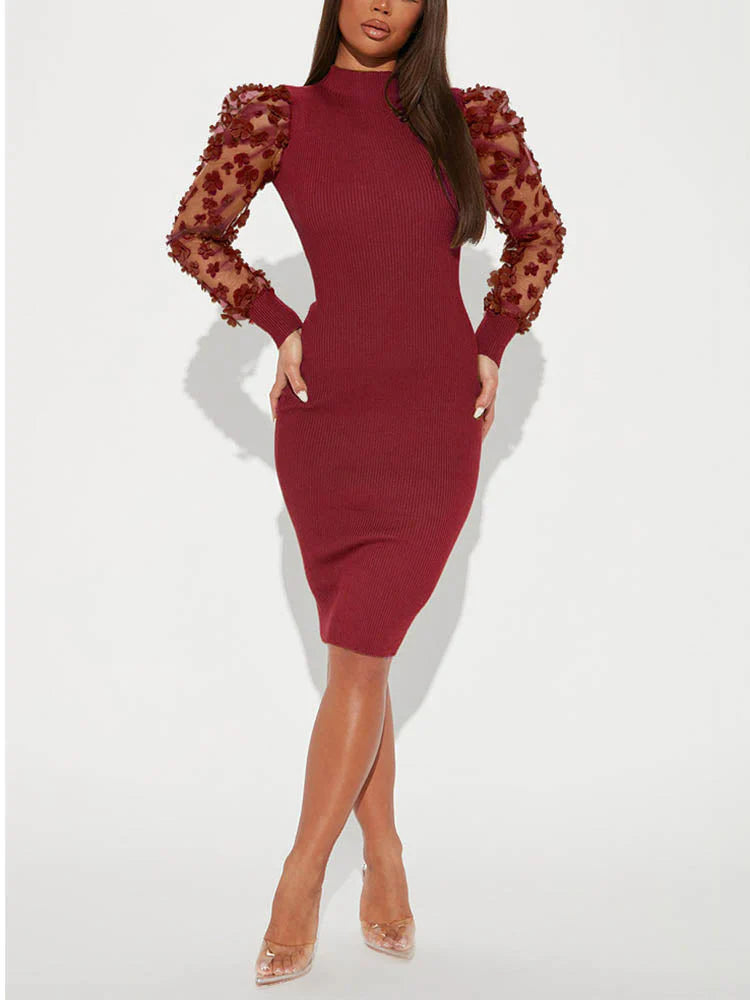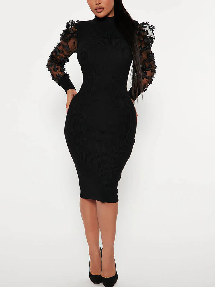 Mesh Puff Sleeve Ribbed Midi Dress