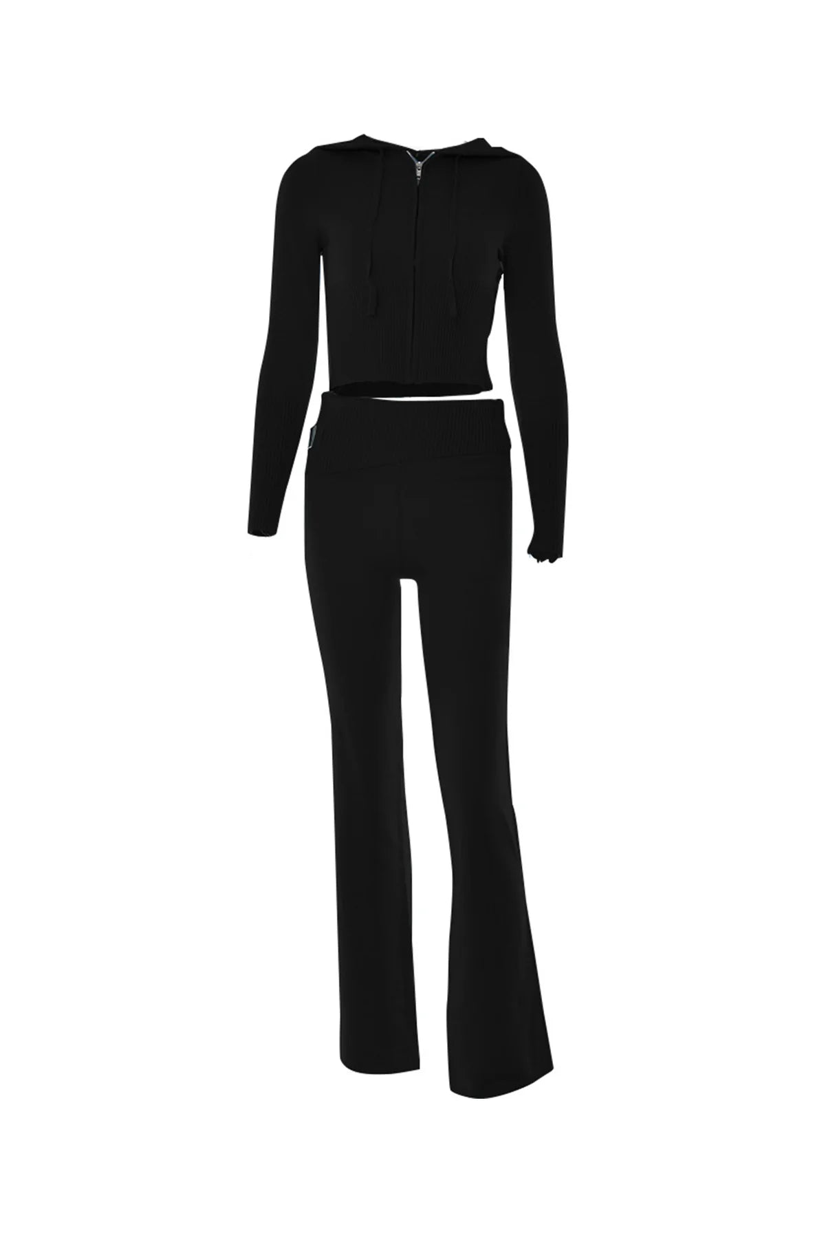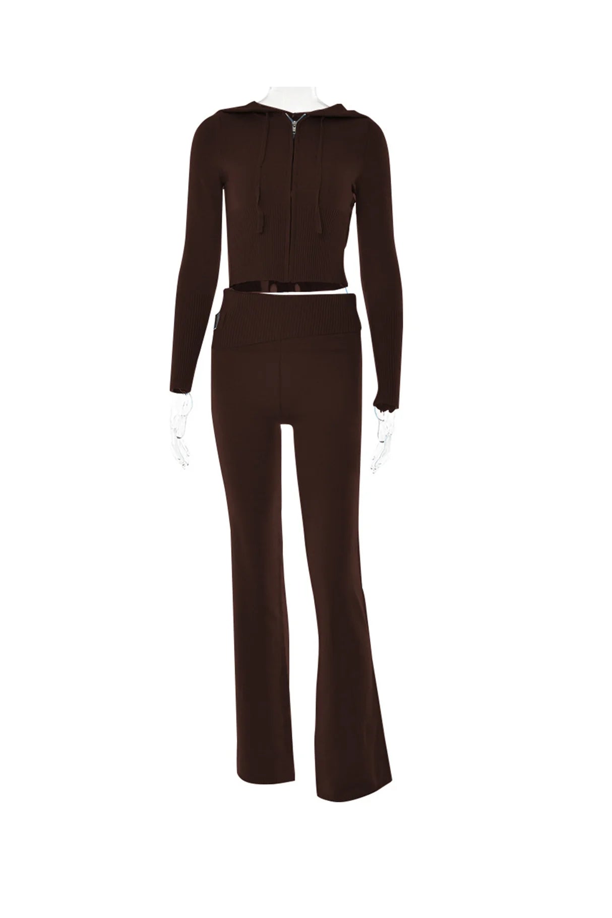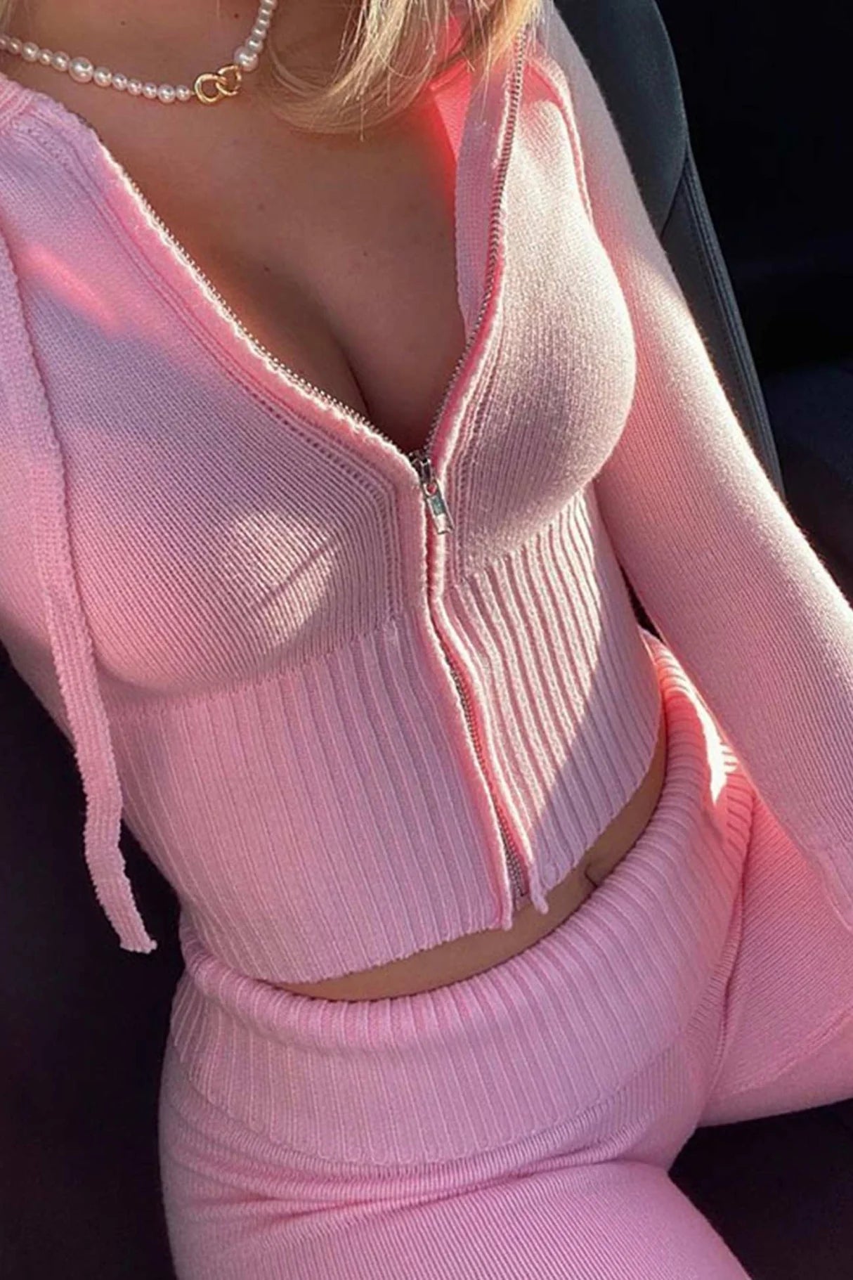 Zip-up Hoodie Fold Waist Pants Knit Suits