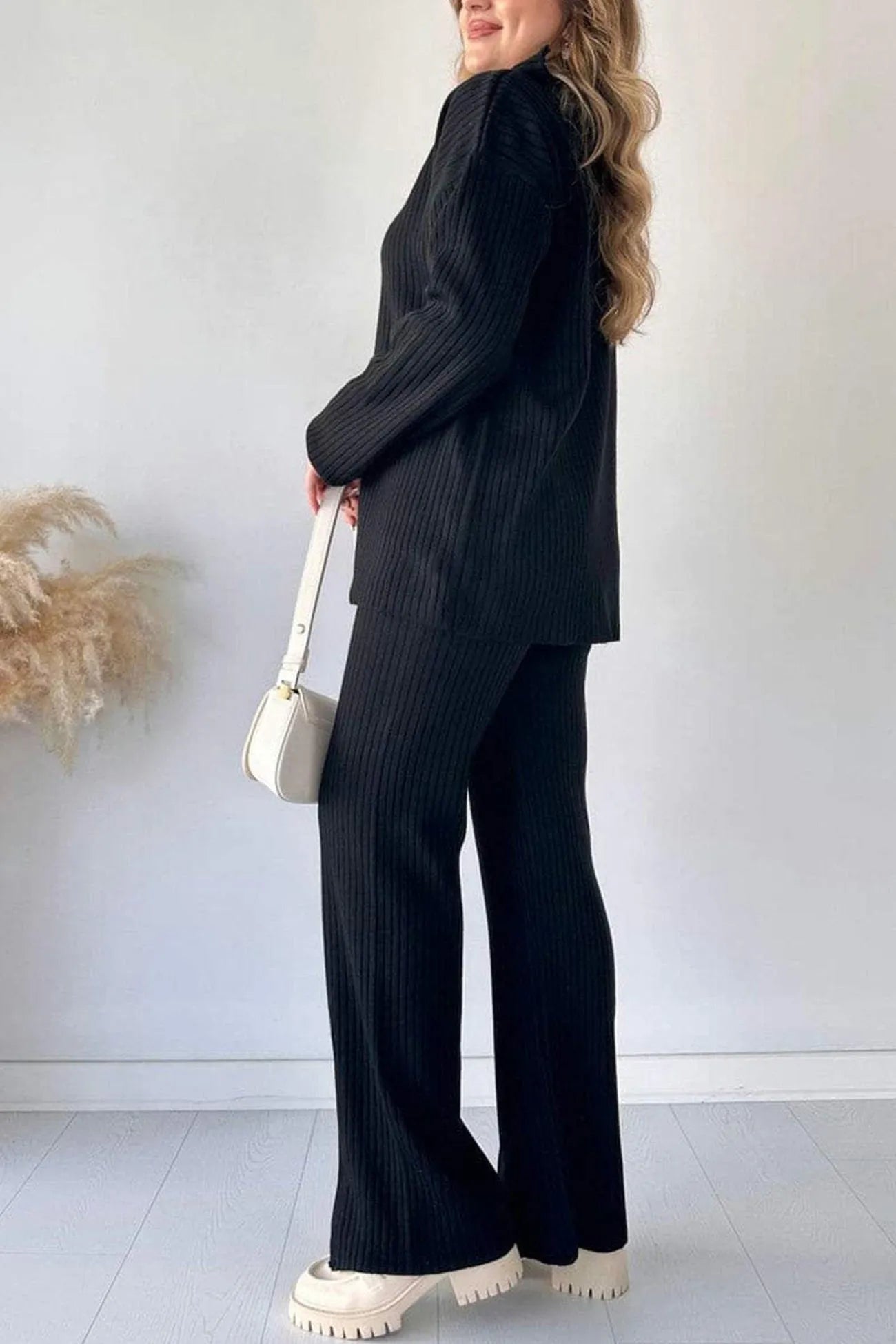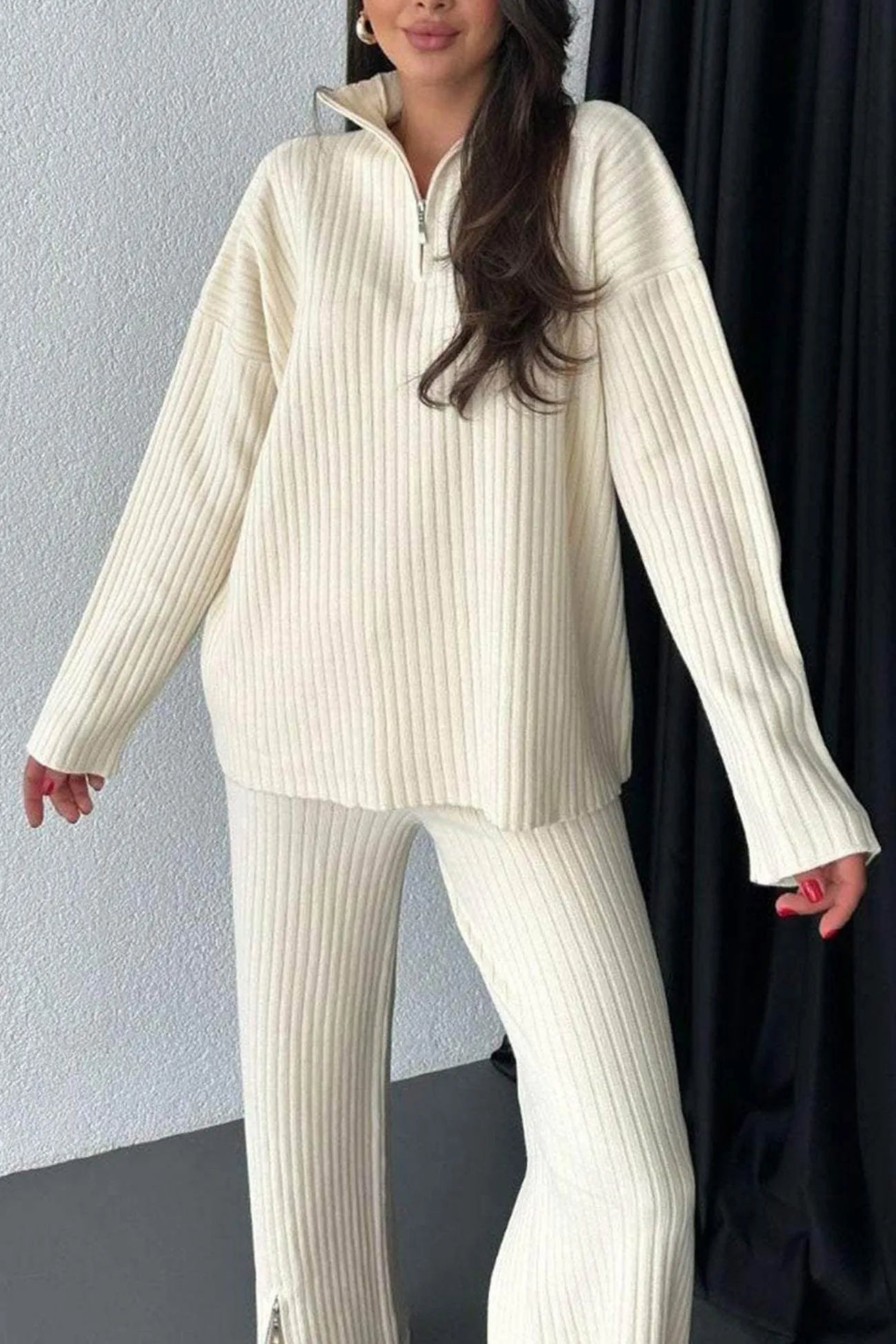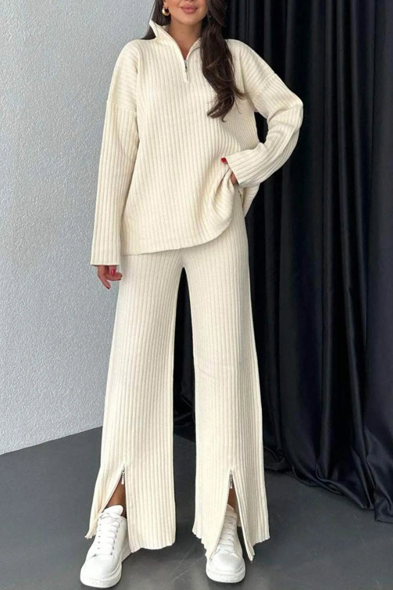 Zip-up Slit Ribbed Knit Two-piece outfit